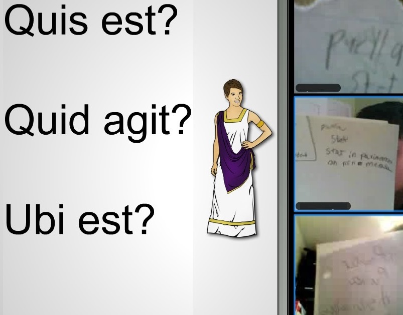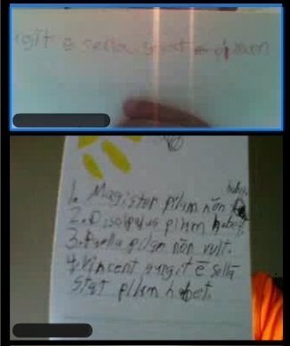 The process for the Dictātiō is exactly the same as brick and mortar, except I just ask them to hold up their paper to their camera every now and then before typing the sentence on the whiteboard for them to see. I did not explicitly teach macrons, but instead provided a Pop-Up reason for why they’re there during the first Dictātiō when a student asked about them (i.e. “they represent a long sound”). As you can see, they are hearing, and noting those differences just fine. These are 9 year olds.