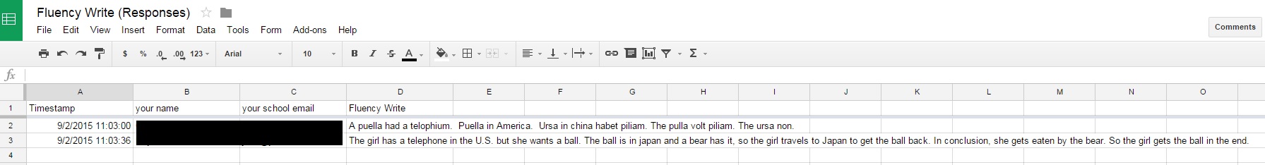 Next up, we have two 5min story retells. Note only were they the first retells, but they were the first compositions in Latin, period. Here’s the disclaimer on these; the retell was the very last thing I asked the students to do, we were running out of class time, and I wasn’t going to see them again. Due to difficulties with these kids using a Google Form for the first time, and one kid who left to go pee (ah, elementary school), I only got two retells: