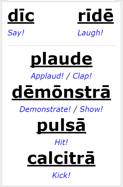 I think certain verbs are included in many TPR lists because the idea is to give classroom instructions in the target language. Not only do I often give instructions in English, but students don’t need to spend time with “aperī librōs!” to know what I mean when I say that while also opening a book. It’s self-evident. This almost reminds me of “teaching” the alphabet, or numbers. We can stop doing that kind of stuff now and actually communicate. So, I looked at the TPR verbs again, and chose ones I’d enjoy using in class, and that lend themselves to more entertaining moments. For example, if throwing and catching a ball is remotely fun, jumping, ducking, and kicking it is a major upgrade to compellingness! Here are some screenshots showing how my TPR Wall has changed: