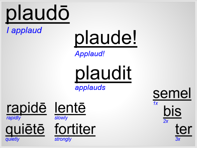Whereas the old PPT had a ton of options, I’ve sequenced the verbs in order to take students through 3 batches of ~20 words. Why the PPT at all? I plan to treat this as a challenge for students to listen as best they can, then show (i.e. “demōnstrā!”) those word meanings. There’s even a built-in comprehension check slide of all previous words between each section. I piloted this with a class on one of those random days due to testing and we had a blast. Still, the class was really only to keep it together for the first two batches of words, with many already acquired (e.g. bene, male, rapidē, lentē, quiēte, surgere, cōnsīdere, iacere, capere, plaudere). Therefore, next year, I won’t move nearly as fast with the beginning students.