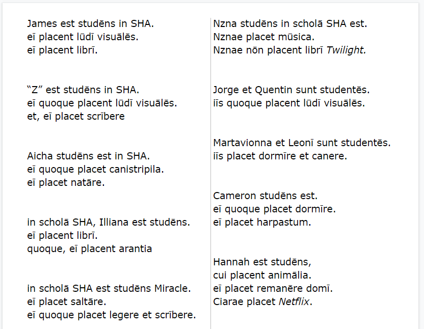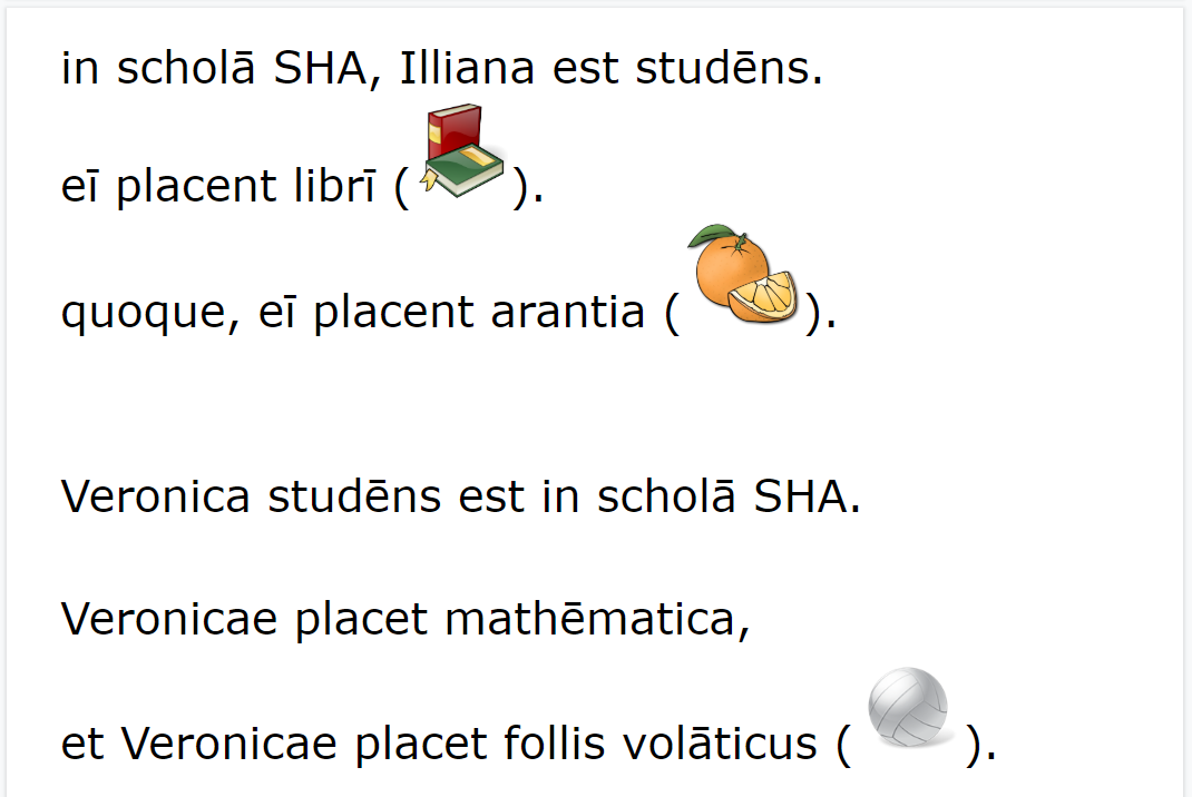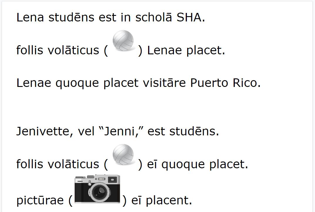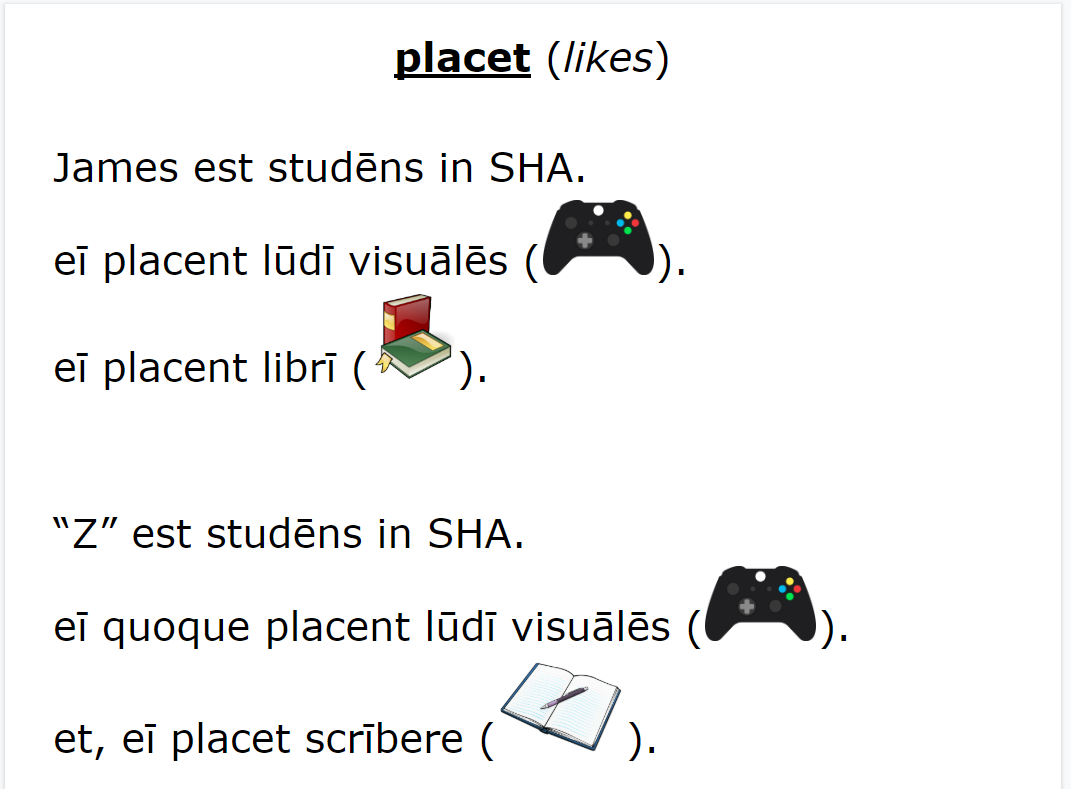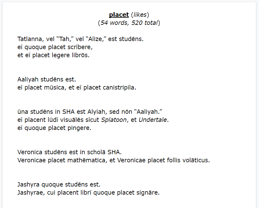 Other changes are less obvious. While last year I chose to include ecce, scīlicet, and ēheu, in the first text, I went ahead and ditched those, not wanting to bog down the reader with words that are harder to grasp, not holding much meaning on their own. This year’s statements also repeat key vocab a bit more. There’s also more variation. Look at how the text progresses, both in word order, as well as exposure to grammar. As students continue reading, messages are part of a growing familiar context—peer interests:
