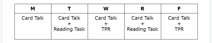 Card Talk is a prime example. This activity results in details about students and their interests to type up after as little as 10-15 minutes of class time. Therefore, Wed/Fri Card Talk will provide two new short class texts each week, but there’s more; I wrote about reintroducing Cloze sentences, which I now plan to do weekly. Students work with a partner to fill-in the spaces of a new projected text every Monday, just before a quick TPR to finish the day. The content of this text comes from Friday’s Card Talk, also printed for Tuesday (and Wednesday’s typed and printed for Thursday). Here’s how the week looks in terms of prep during planning periods, all between 2 to 15 minutes to complete: