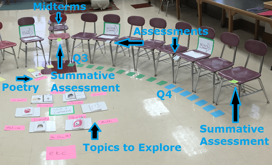 The content of the first quarter (Q1) is students themselves and their interests. We read two novellas at the end of the quarter, marking the transition to Unit 2, Roman content, which persists through the end of the year. Daily assessments throughout are “following rules, signaling, responding,” and “quizzes.”