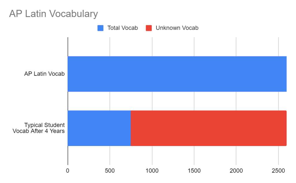 It could be argued that AP courses are intended for the academic elite, and not “typical” learners. Assuming an “advanced learner” can acquire twice as many words, though, which is a biiiiiiiiiig assumption, that still only results in 60% of the vocab. Could that vocab account for a text coverage of 80% of the 11,700 total words? If so, that’s still nowhere near a readable level. Clearly, students aren’t actually reading Latin on the AP syllabus. If not reading Latin, though, what is being measured on exam itself?