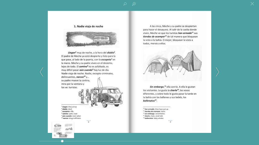 This is a robust platform with management tools, and individual student logins. Teachers can create “classrooms” for different sections, courses, groups of students, or groups of books. Teachers can track how long students spend reading, too. There are supplemental activities, with more added along the way as teachers contribute (available to all), and there’s audio for each chapter, either recordings uploaded by the author themselves, or a default adorable Italian pronunciation (but not both). Storylabs now has the same layout as the physical book. A menu to the left acts as a table of contents, so students can jump to chapters, the glossary, and activities. There’s a phone app on the way, too. Individual books are $60 for all students to access (up to 180). There are combo deals, such as the Mini FVR Library (any 12 titles) for $300 ($25/book), and the crazy deal with Andrew Olimpi’s books for $675, right now $22/book, and dropping as more are added (i.e. the cost remains $675 even as new books get published throughout the year).