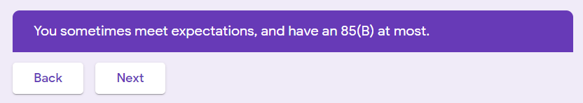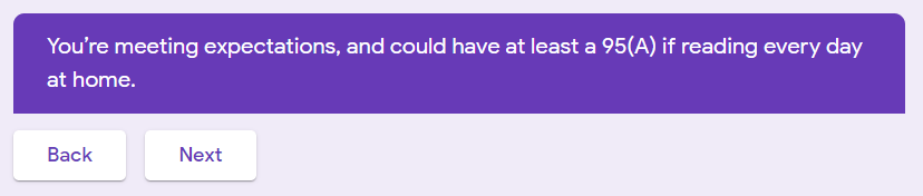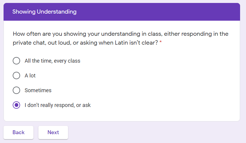 To recap, the example student isn’t reading each day, so an 85(B) at most, is taking pics of notebook (i.e. copying things and maybe doing annotations during class when prompted), and doesn’t respond (e.g. not even in private chat over Zoom). I’d agree with this student’s self-assessment of a 75(C), especially if they have absences. After all, if they’re missing class, they’re missing out on input. Reading can’t really make up for interaction, either, and they’re not even doing it daily. There’s also the slight possibility that this student’s notebook pics submitted each week aren’t evidence that they’ve been present and engaged during class, receiving input and meeting expectations. For example, I’ve had students send pics of the book we sent home, and screenshots of randomly searched Latin on the internet. A student like this might *think* they’re in the clear by submitting something each week, but the combination of not responding in class, with no actual evidence of participating is tricky. In rare cases like that, this student’s grade could be as low as 65(D). Of course, it shouldn’t go that far, with reaching out to the student a priority (e.g. “hey, thanks for submitting pics, but we need to see *your* work from class, not a book [you said] you read.”).