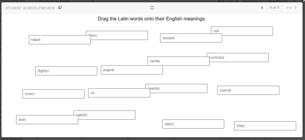 A colleague showed us their department’s platform for Mathy stuff, and in an unlikely move, I’ve actually started using it in place of Google Slides for Flashcard Blitz! It’s one of those platforms that doesn’t require students to create a new login, and has a teacher dashboard so you can follow real time student progress (e.g. “hey Jey, I’ve noticed you haven’t logged in. Any connection problems, or…?”). It’s also got built-in card sort matching, which is an ideal way to have simple manipulative flashcards.