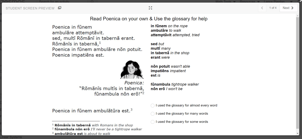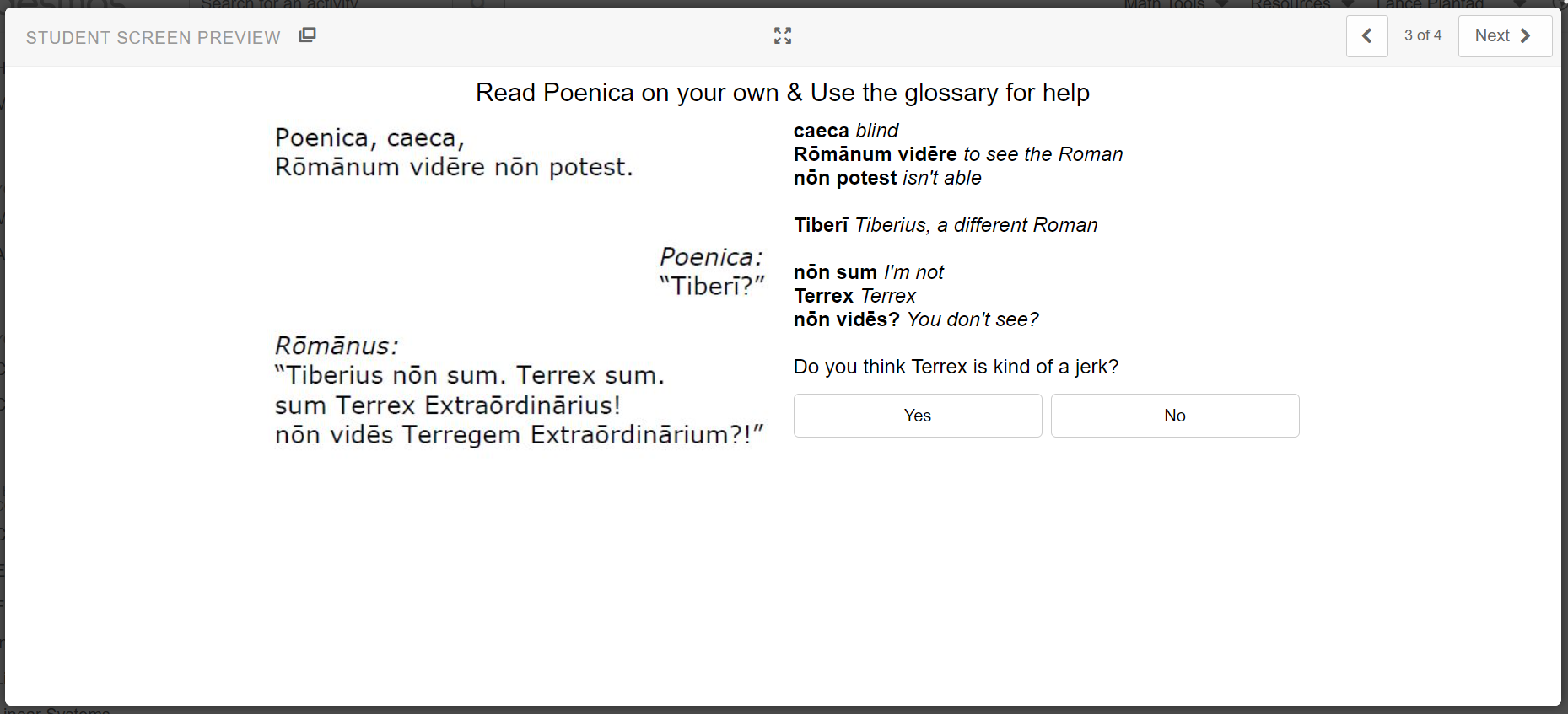 You’d think students would click straight through, but no. Once the expectation is that students read, and there isn’t some product to complete (e.g. answering comp Qs), I’ve found that students do spend the class time doing so. Besides, this has been showing me how reading speed is quite slow. For the students who have been reading a lot outside of class time, though I’ve intentionally left out of that last page. Students do, in fact, ask me to establish meaning of words. That’s solid evidence they aren’t just clicking through to the end.