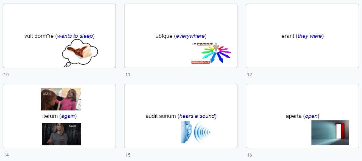 The slide format is simple, divided into two sections. In the first section, each word has one slide: the Latin + English [w/picture, whenever possible] together. The next section includes just the Latin (i.e. flashcard front), and then just then English [w/picture, whenever possible] (i.e. flashcard back). - Spaced Study & 10-20 Max