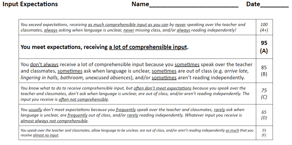 These processes/rules have been in place because they lead to learning and acquisition, period. I agree that forcing a student to make eye-contact is neither necessary nor culturally responsive. However, there’s not one example of someone learning a second language who either hasn’t received input, or is confused about the input they do receive. Even if not explicitly stated as “rules,” these processes are at play during language learning, and they’re certainly not too much to ask. Since they’re part of daily class expectations, the practice is more aligned with the course grade at a 1-1 level, with more student ownership (e.g. “You chose to focus on listening. What have you been doing that helps you?”). So again, I’ll ask students to start with the one process/rule that seems most challenging. For example, really outgoing students tend to talk to their classmates, not listen, and then feel like they get behind (because they do, not receiving as much input as their classmates). They should focus on “Listen.” Then, they self-assess every other week.