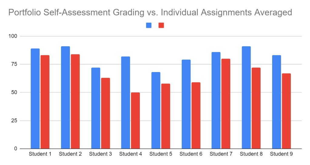 Aside from the top students, the rest who preferred a more traditional approach to grading were missing an average of 30% of the total assignments, the highest being 50%! This could be a case of students not yet understanding how the traditional system fails them. Hell, most teachers don’t quite understand that either! Or if they do, they have to find solutions, like establishing retesting systems that cause more work for everyone. I wonder what the same students would say if they saw the two grades side-by-side. A quick calculation showed that these students’ grades would be between 6 and 32 points lower, resulting in three course failures. Of course, there’s no reason for me to think that students know the difference. Therefore, I’ll show this chart next year when we do the first self-assessment to help them understand: