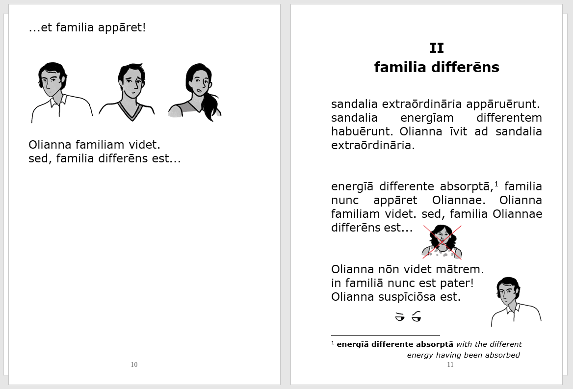 While many Pisoverse novellas contain references to each other, none of them are what I would consider a sequel. This new book is different, though, picking up immediately in mediās rēs of an event towards the end of Olianna et obiectum magicum. As a true sequel, then, Olianna et sandalia extraōrdināria was deliberately written to include almost all the vocab from the original. The result is a book with 40 words, but just half are new. This reduces the vocab burden for any reader already familiar with the first book.