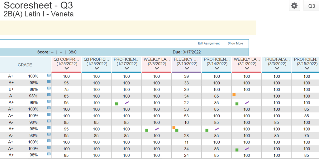 As you can see, this gradebook still shows students who are missing work (orange squares), who were absent (green squares), and who are exempt from the work (purple diagonal). Unlike most ungrading approaches, though, the overall standards grades in the first two columns are seen all throughout the grading term. In a true ungraded approach, the grade isn’t entered until the end of the grading term, usually after a conference with the teacher. That places full focus on learning, not numbers. However, my compromise is to have an updated grade throughout the term to answer all the “how are they doing?” questions coming from parents, admin, and in-school supports without completely changing culture and expectations otherwise required by a true ungraded approach. My compromise still takes focus off of grades and scores for everything else, though, so I’m hopeful. Also, it’s a much cleaner look than what I had before. Compare the gradebook above with the busier one from that year: