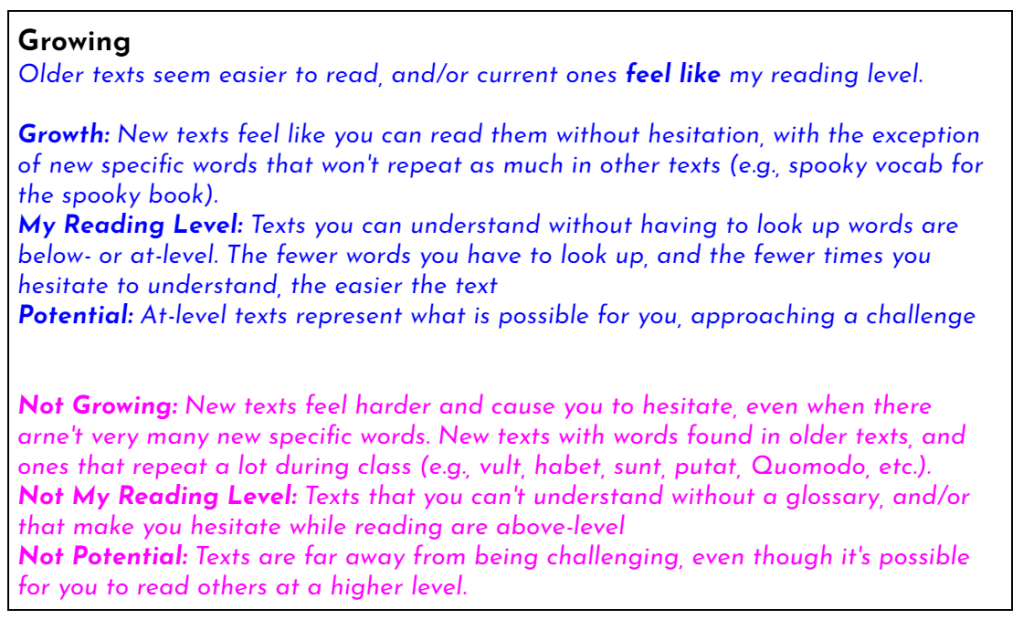 **Update** At a certain point, the focus of growth becomes potential, so the Quarterly self-assessment rationales ask students to evaluate how well they’re meeting their own potential. The reason for this is that students tend to make growth no matter what, but I’ve had students phone it in, and just be like “yea texts are easier now.” That’s great, but what about possibility, right? To these students, Latin class appears very differently from other classes. Thus, I’ve projected this reminder, and will do so each quarter next year: At some point, you might think Latin is an easy class during which we don’t “do anything.” In truth, it will be you that stops doing things. Reading is a thing. Thinking is a thing. Understanding is a thing. Working with others is a thing. Doing your own work is a thing. Listening to what people have to say is also a thing. Taking ownership of your learning is a thing. Keep doing those things. That’s how to learn a new language (and other academic content, too).