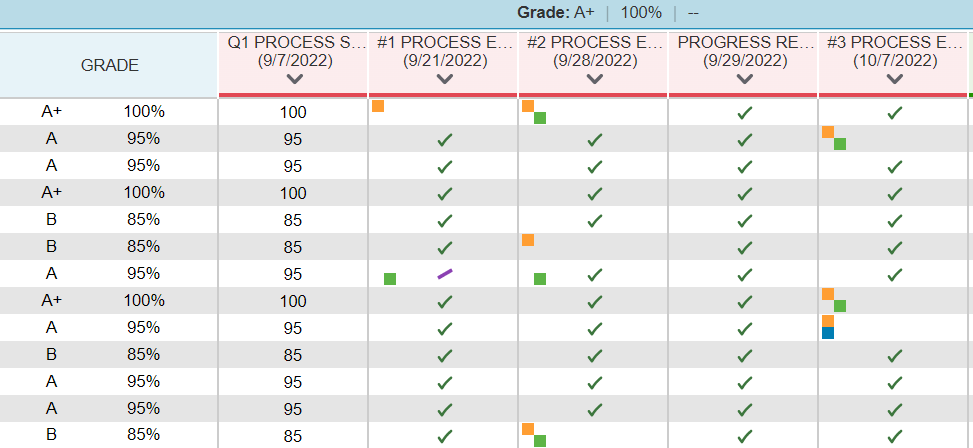 2) Once per quarter at the end, and this first halfway progress report moment. So, 5 total. After quarter 1 ends I’ll just carry over the grade which will be self-assessed at the end.