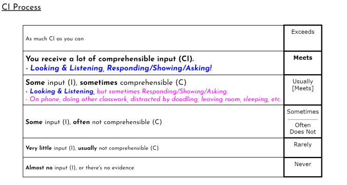 Not so bad, right? Imagine starting class with that do now/activator/hodiē doc of yours, then giving a quick reminder of class expectations. Mine would look a bit like this: “class, our goal is to have a positive language experience by understanding ALL the Latin today, right? Well, let’s take a look at how to do that,” then I’d project my criteria as shown below: