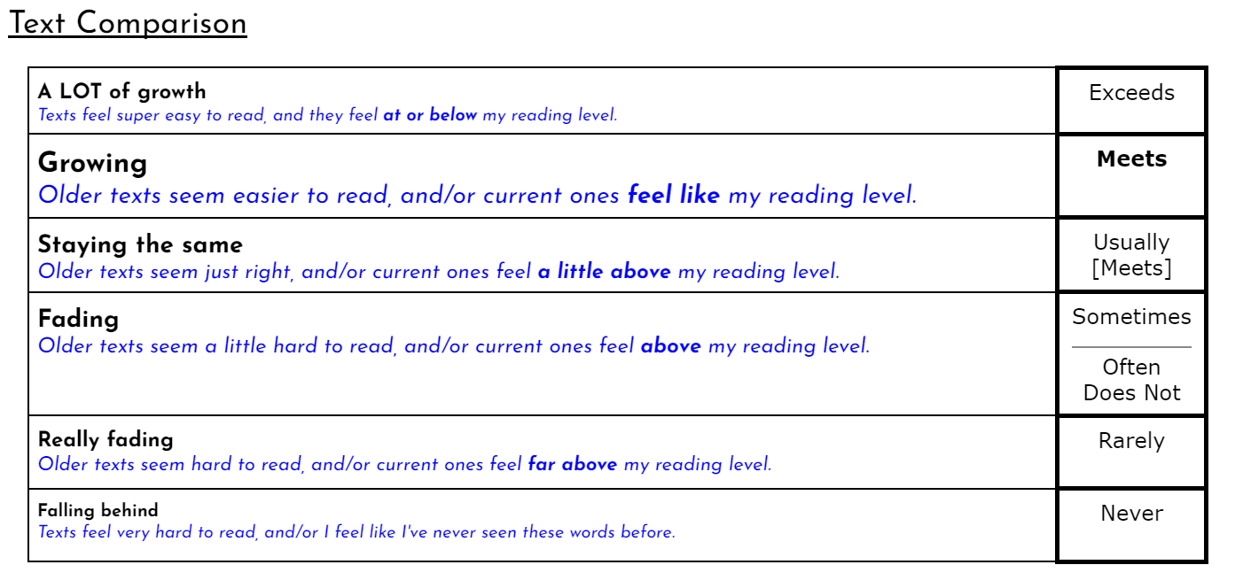 And here is my Growth rubric along with its older version below. Again, note how much more descriptive this is without students’ attention being drawn towards how well they’re meeting the criteria: