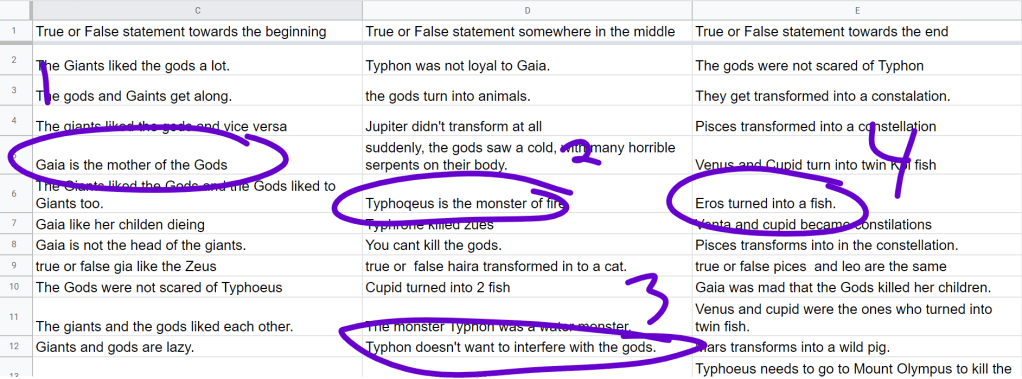 So anyway, the digital option has students submit their quiz content in a Google Form (screenshot above), then you project the sheet when it comes time to take the quiz, and choose which ones students should answer (e.g., zoom in and circle w/ digital pen on a smartboard, as shown on the screenshot below). Granted, this option will only collect the quiz content (not responses). If you’re planning on collecting those quizzes, you’ll need scrap paper or something. Since I don’t collect them, students respond right in their notebook (i.e., in a portfolio system, they can choose to upload this as learning evidence, or not).