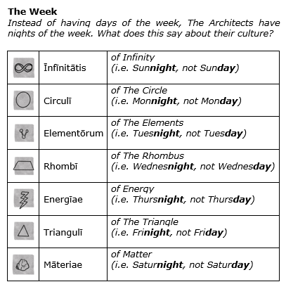 This is an ancient culture, therefore products and practices differ, just like you’d expect when reading about Classical antiquity. For example, each entry is dated not by days of the week, but by nights. A chart in the Appendices lays everything out in one place.