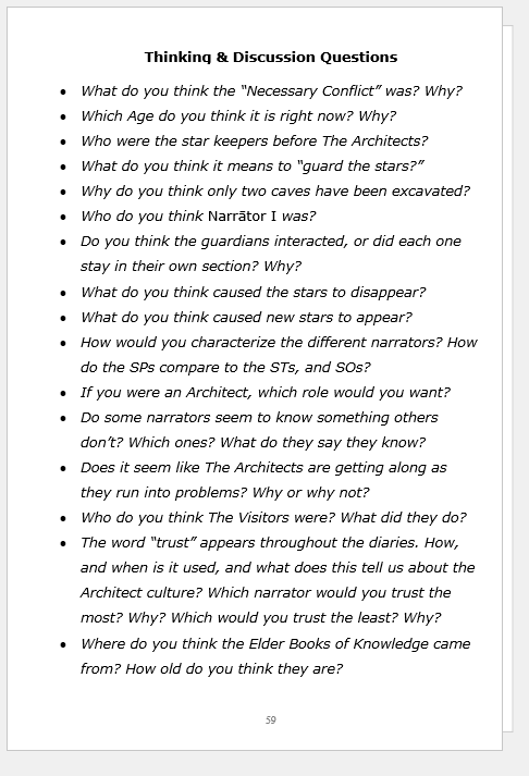 diāria sīderum is a personal favorite. I think this one is my best, honestly, though it appears to be an unlikely choice for the Classicist Latin teacher. Then again, they’re not the ones reading the book. Students are! The sci-fi/fantasy narrative has a bit of a “who dunnit?” feel to it, with students seeking to figure out what made the book’s ancient culture disappear. It’s in three parts using half cognates. The first part has 30 cognates and 30 other words (i.e., 60 total), and the other two parts add 20 and 20 words to that, respectively (i.e., 100 total). It was written so that my Latin 1 class could read a 1000-word long intro to “The Architects” in Part 1 to get a sense of what was going on just before their disappearance. Then, during independent reading, anyone interested could finish Parts 2 and 3 that provide more clues as to what happened.