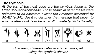 There’s also a secret message conveyed through mysterious symbols towards the end of the book. The Appendices has Latin letter equivalents: