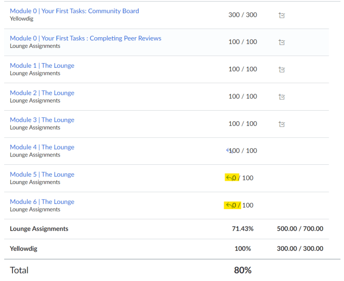 I wrote about my experience with Harvard points for their Instructional Leadership Certificate, and I’ve got more timely evidence to share. They’ve updated course requirements to earn the certificate so one must get 300 community discussion points, and complete 5 of 7 weekly assignments. I maxed out the community discussion points after the second week with simple posts and replies that made sense (i.e., nothing fancy), and have been completing the one assignment weekly. So, I did what a typical student might do and figured out what my grade would be if I stopped doing assignments altogether! To be more accurate, though, I started doing math by changing grades (highlighted in yellow) to find out how few assignments I’d have to complete in order to get the minimum 80% for the course. Here’s a screenshot: