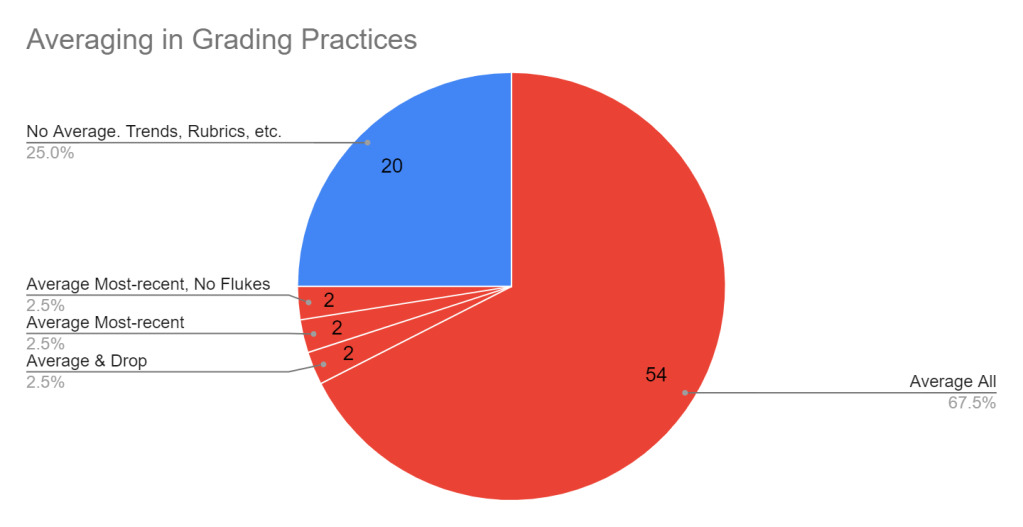For my third poll in a large Facebook group of 12,600 language teachers in this mini-series on inequity and grading, I asked about averaging. A FRACTION of teachers responded this time, with a total of just 80. Compared to the previous poll participants of 585 for late work penalties, and then 625 for homework, I wonder if this is because averaging is something teachers let the gradebook handle without giving it much thought. Most teachers don’t question homework, but they still play a more active role in creating and assigning it, right? Even setting late policies is something teachers…do. Averaging, though? Looks like we might be in a “set it and forget it” situation. The thing is, the gradebook only does what we tell it to (or its default setting), so if we’re not thinking about that, well…